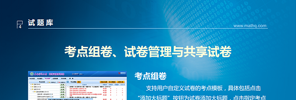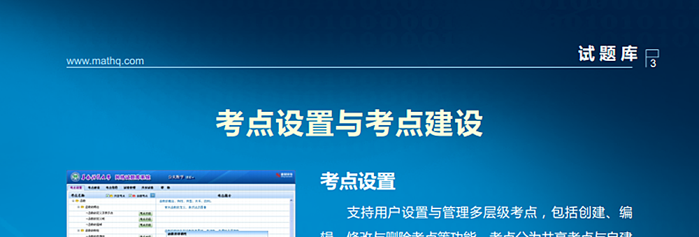 历经10余年的技术积累与应用开发,数苑先后解决了上述一系列关键问题,最新推出了《在线考试及其预约管理系统》,彻底解决了实施发展性评价的技术瓶颈问题。该系统的底层编辑器支持公式图形的在线编辑,试题库模块支持考点、试题与试卷的在线建设,在线考试模块支持大规模同步并发在线测试与发展性评价,预约考试模块支持在线考试的预约管理,并支持开启微信服务。
