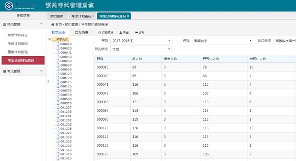 参加本次同一批次考试的学生共计5400多人,涵盖了该校2017级绝大部分专业。首先由教师通过系统的试题库模块组织生成试卷;然后由教师审核试卷后导入系统的在线考试模块的考卷库中,面向参加考试的专业班级发布在线考试;再由负责考试管理的教师通过系统的预约管理模块面向学生发布考试预约。本次考试安排中,教师于10月23-24日安排了考试相关数据并发布了预约,学生自主预约时间为10月25-26日。